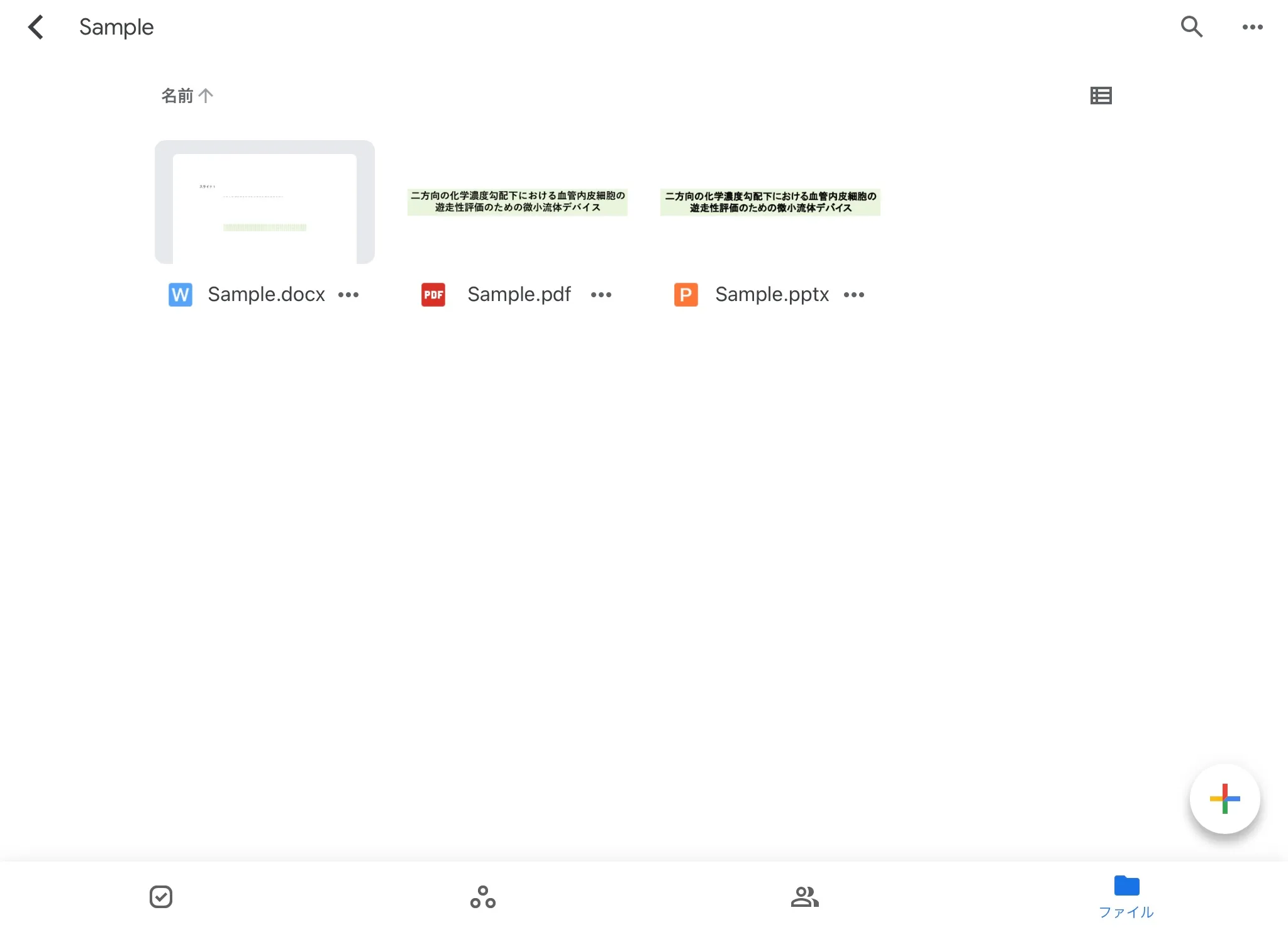 3. Google ドライブ上で開きたいファイル(PDF,Power Point,またはWordのファイル)があるフォルダまで移動し,開きたいファイルのファイル名の横に表示されている「・・・」をタップします.