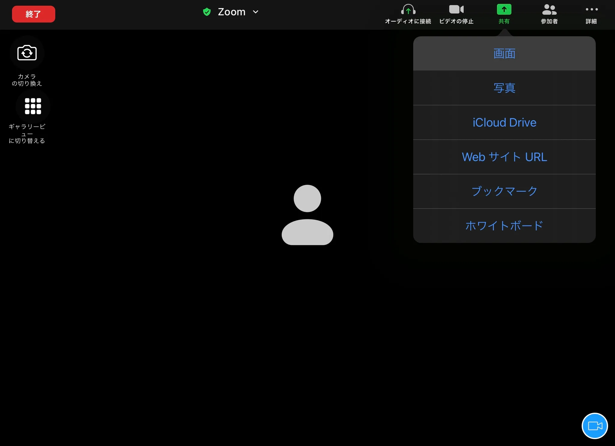 1. iPadでZoomの会議室を開き,メニューバーから「共有」をタップしてから,「画面」を選択してください.