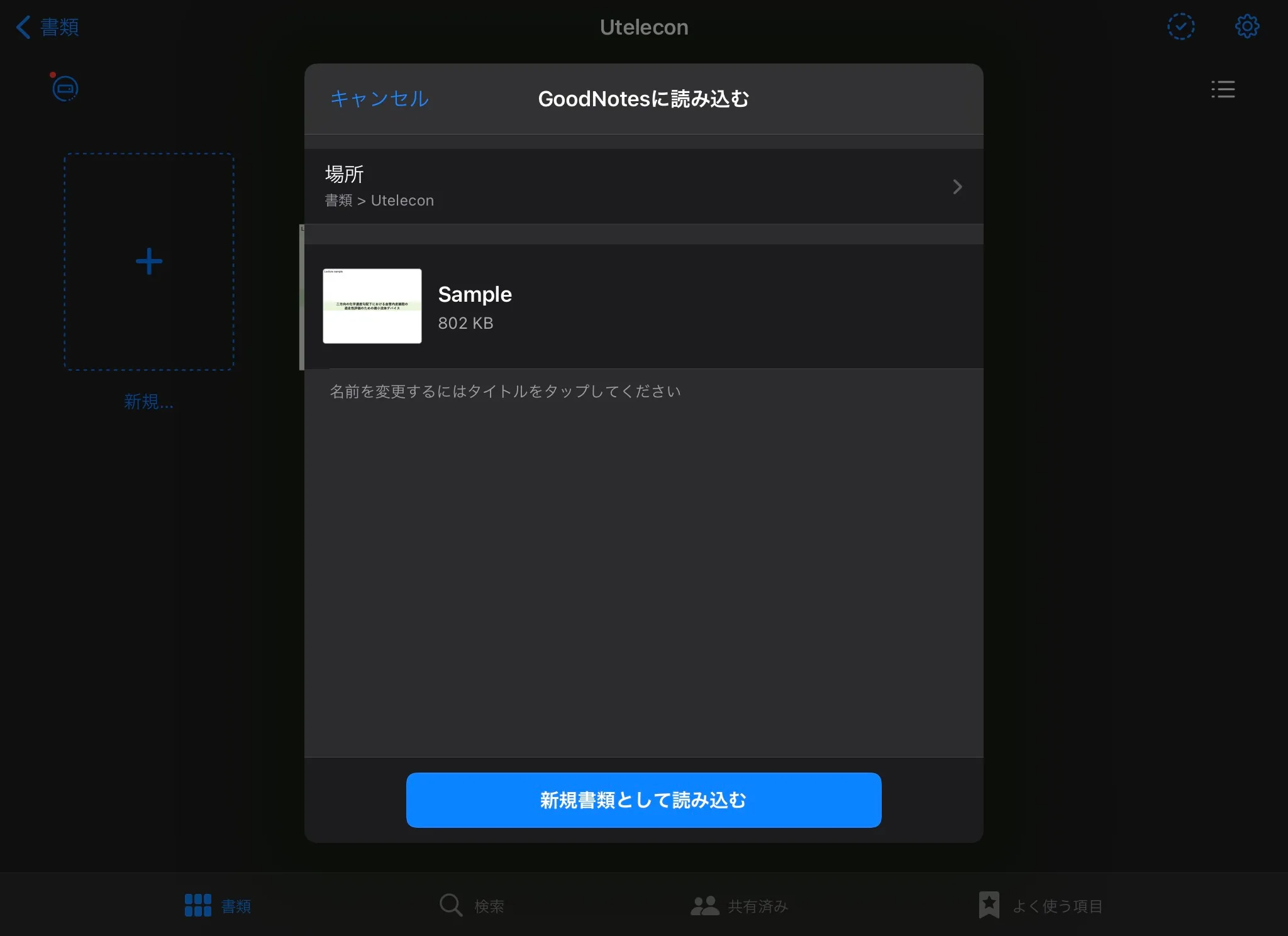 (注)GoodNotes 5で別のファイルを開いていた場合は,「新規書類として読み込む」の他に「現在の書類に読み込む」という選択肢が表示されます.現在GoodNotes 5で開いている書類と事前作成資料を結合したい場合は,「現在の書類に読み込む」を選択してください.