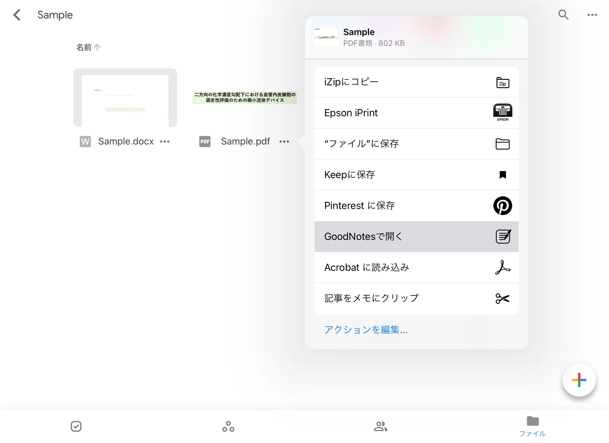 6. 表示されたメニューから「GoodNotesで開く」をタップします.