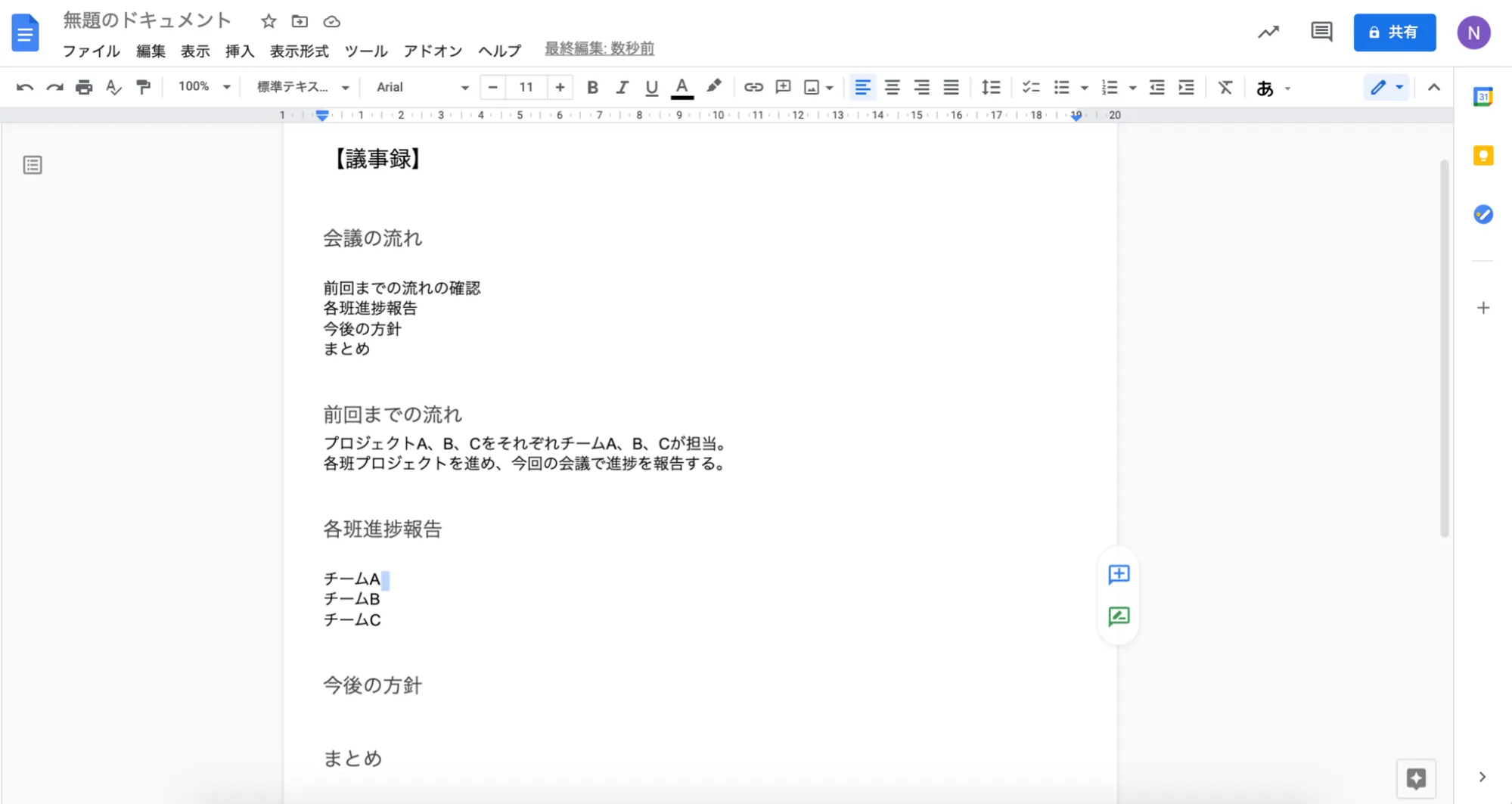 上の例では,「【議事録】」を「見出し2」に,「会議の流れ」「前回までの流れ」「各班進捗報告」「今後の方針」「まとめ」をそれぞれ「見出し3」に設定しました.