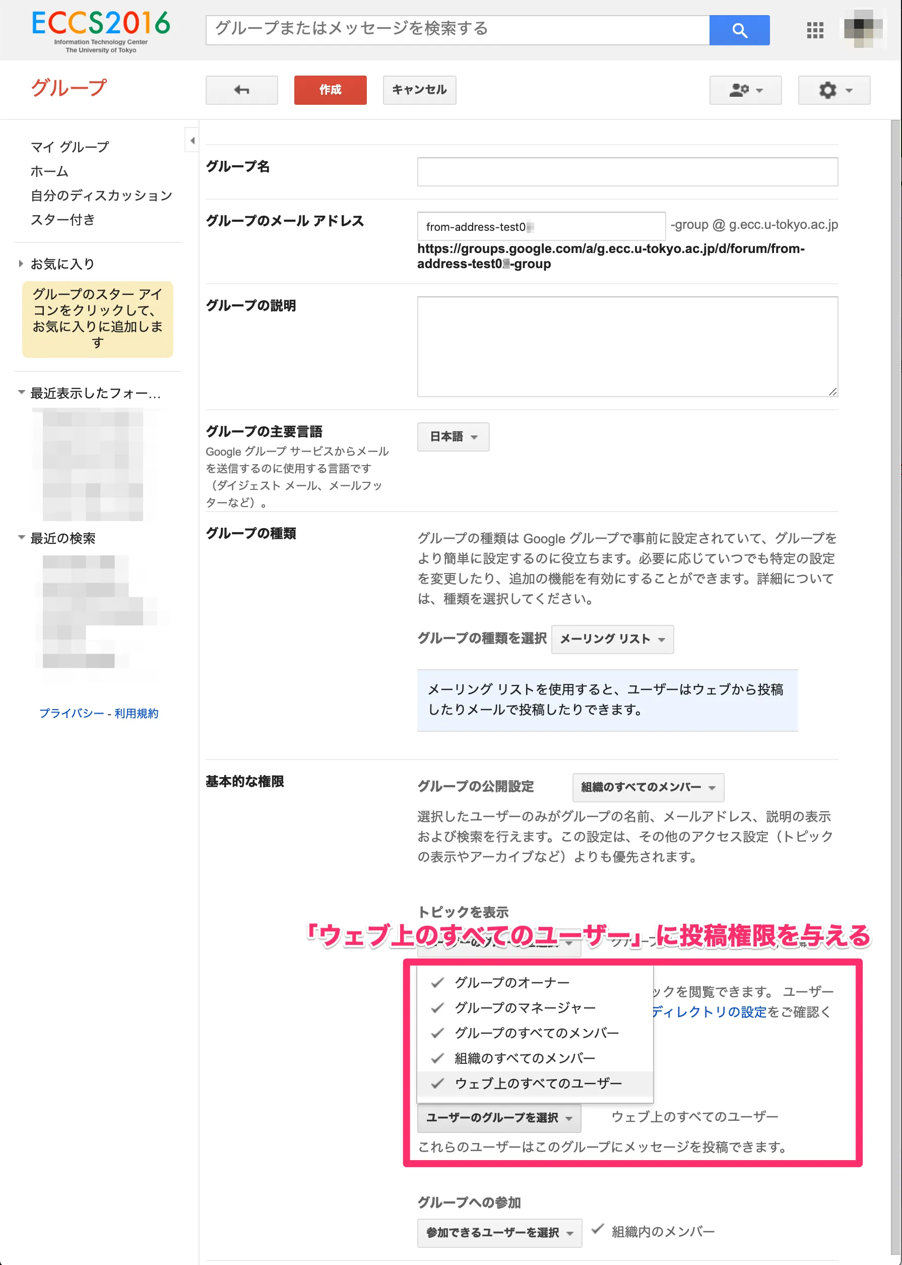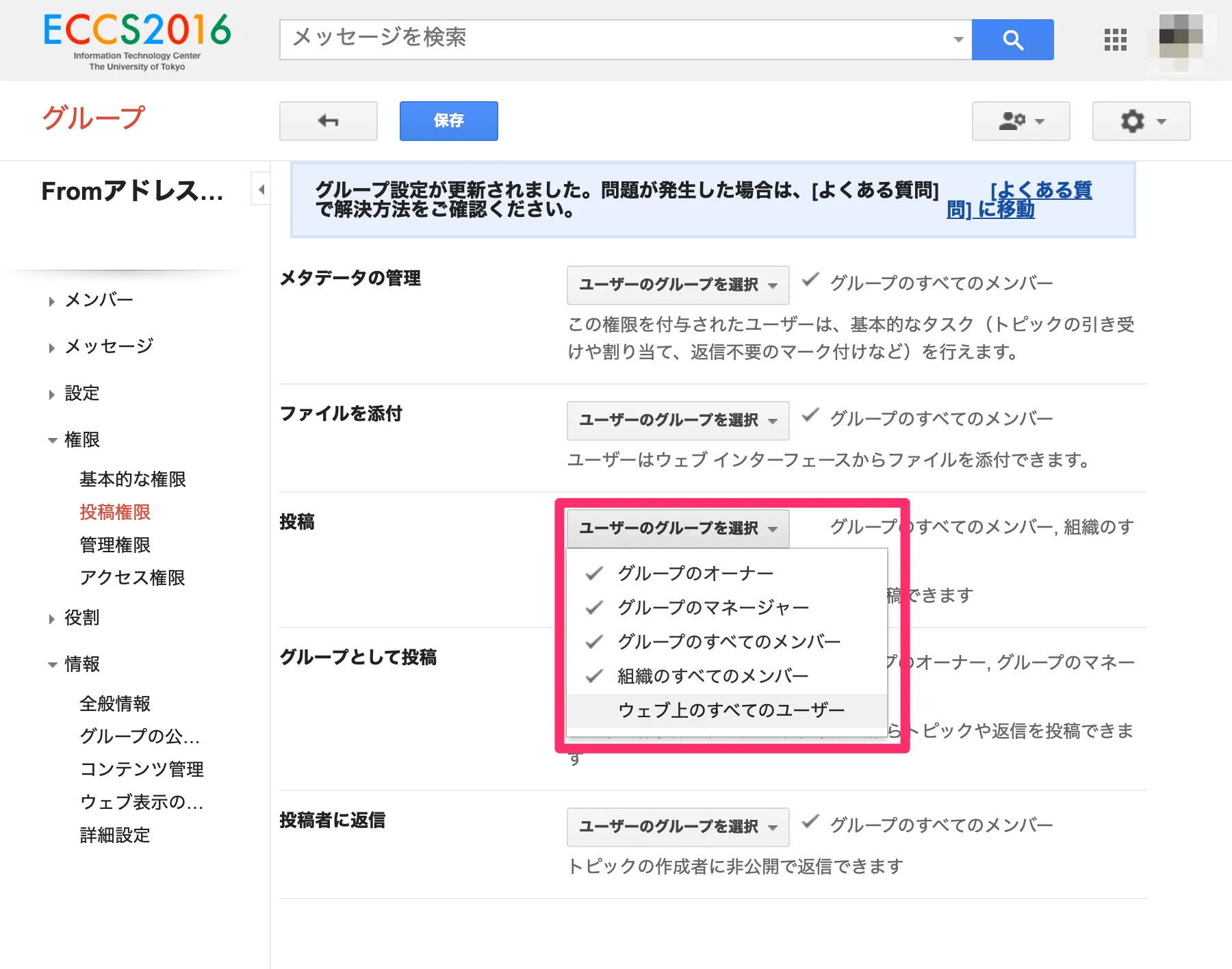 9. この一連の手順の冒頭,Googleグループを作成する際に,「ウェブ上のすべてのユーザー」からの投稿を許可しましたが,必要であればこれを修正してください.