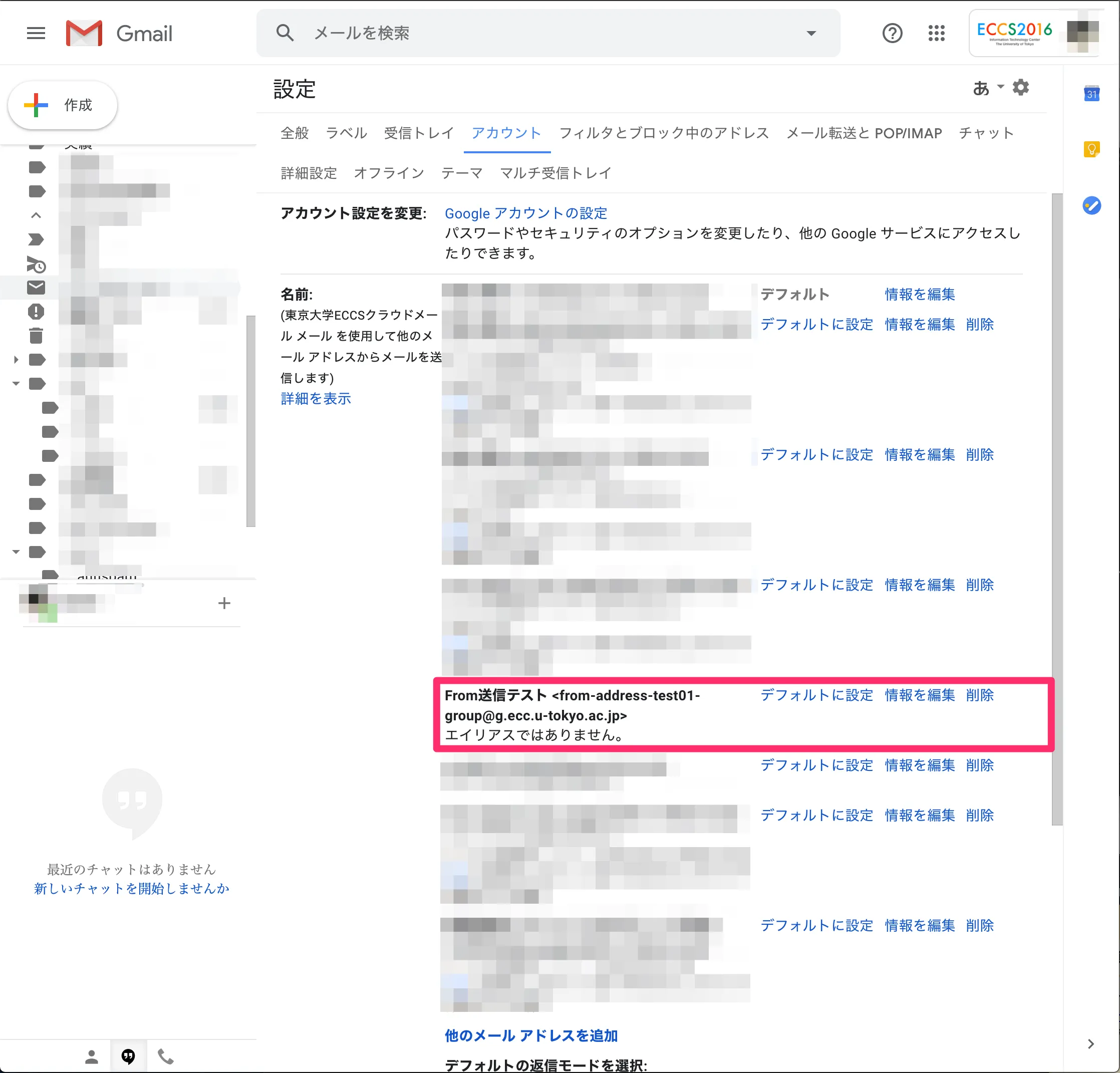 7. ECCSクラウドメールの設定画面で,「名前」の欄にメーリングリストのアドレスが追加されていることを確認してください.