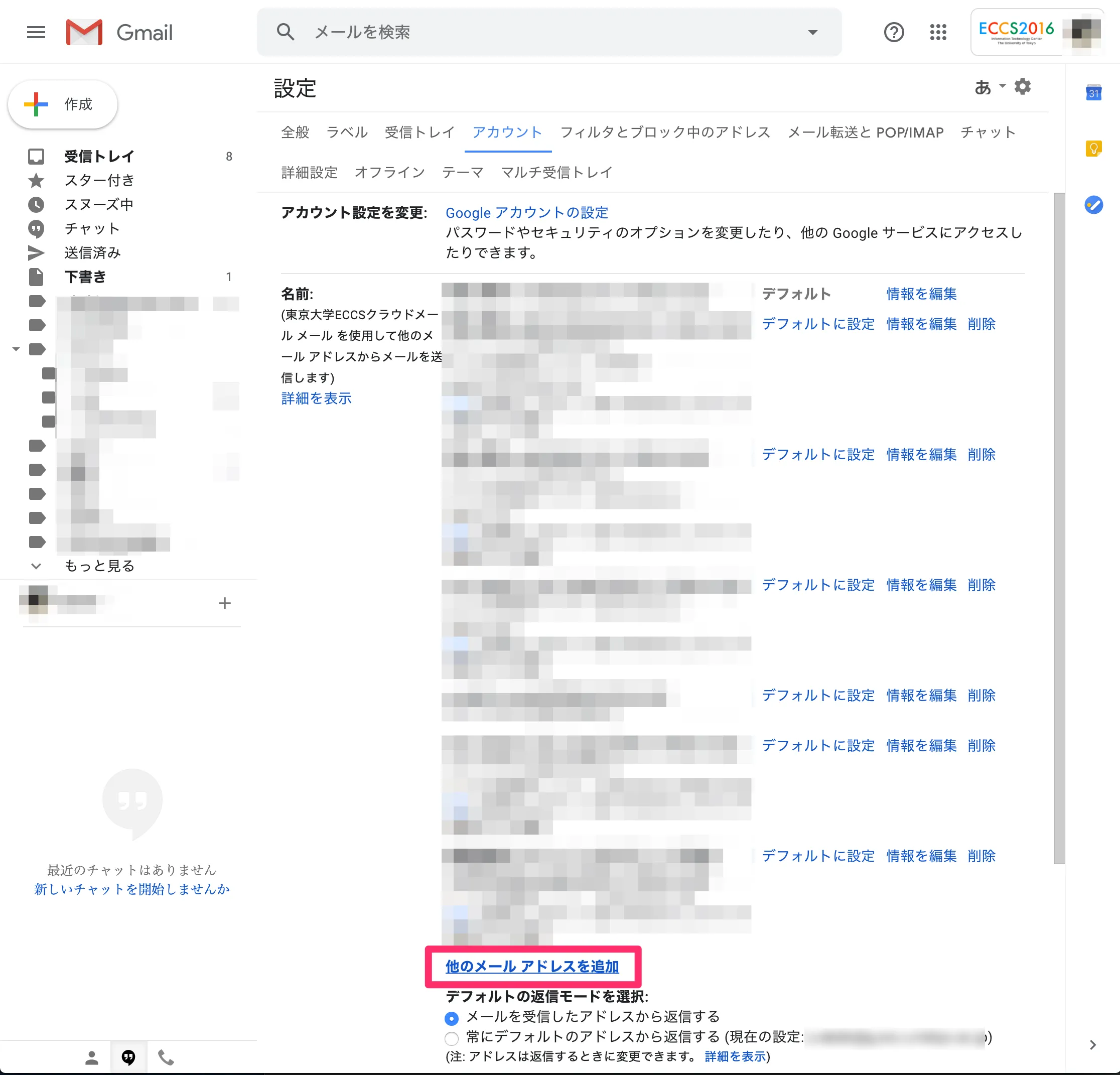3. 設定画面で,「アカウント」タブを開き,「他のメールアドレスを追加」のボタンを押してください.