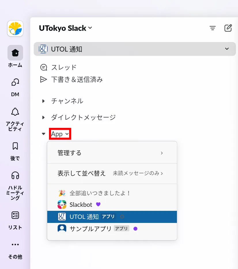 - 通知は,「UTOL 通知」(Slack App)からダイレクトメッセージで送信されます.Slack Appとのダイレクトメッセージは,「App」メニューの「UTOL 通知」を押すと,開くことができます.